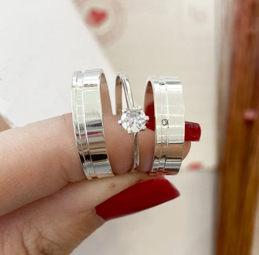 Conjunto de alianças em prata 925 com acabamento espelhado e friso central polido, que cria um contraste elegante e moderno. Uma das alianças apresenta um pequeno detalhe em zircônia, oferecendo um brilho discreto e sofisticado. O anel solitário feminino acompanha uma pedra central redonda, lapidada com perfeição para destacar o brilho e a delicadeza da peça. Um conjunto clássico com um toque contemporâneo, ideal para eternizar momentos especiais.