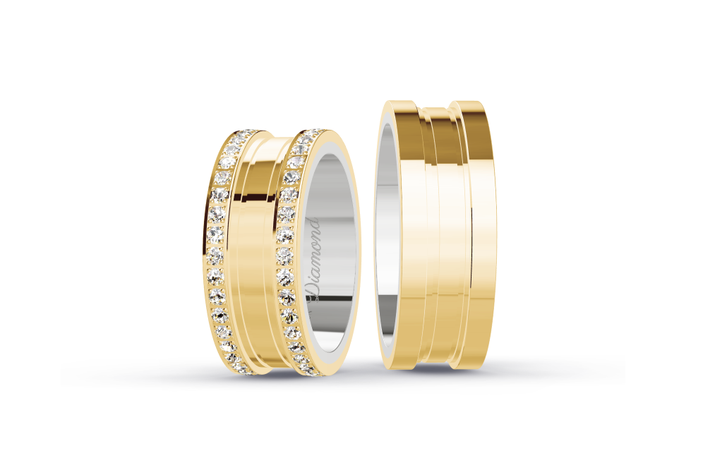 Alianças em moeda com 8 mm de largura — uma delicadamente cravejada com zircônias, a outra com acabamento liso e elegante. Um par que representa a força e a beleza do amor verdadeiro.